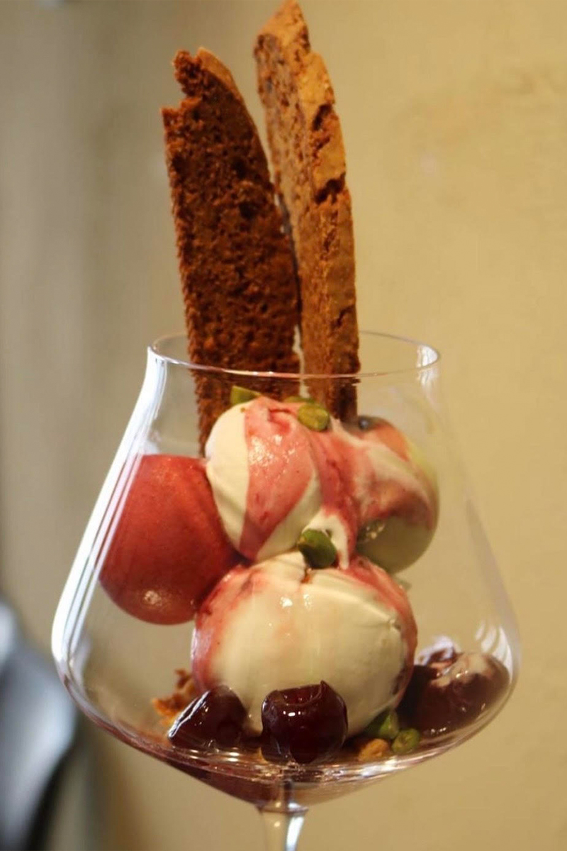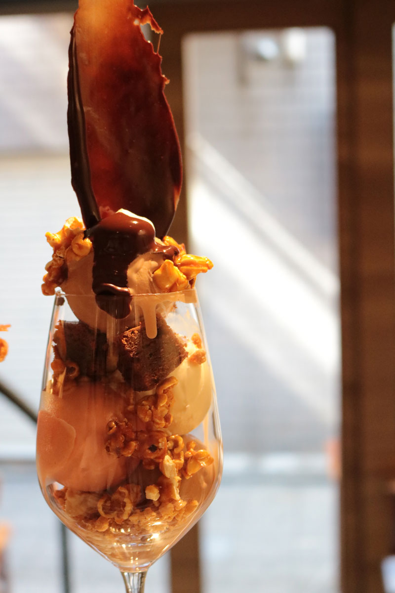 左から順に、アフォガートコーヒーパフェ、抹茶パフェ、北海道ミルクと完熟マンゴーのパフェ、桃とサバランのパフェ、ショコラパフェ